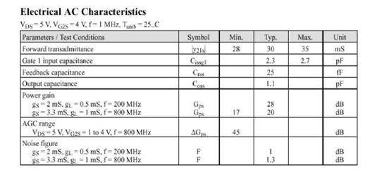 В качестве усилительного элемента УРЧ выбираю интегральную микросхему на полевом транзисторе S595T. Коэффициент усиления данной схемы составляет 28 дБ, следовательно, для получения требуемого коэффициента усиления УРЧ можно включить одну микросхему. Характеристики данного усилителя приведены ниже.