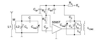 Антенна подключена к входному контуру с помощью трансформаторной связи. Так как микросхема выполнена на полевом транзисторе, то ее включение во входную цепь осуществляется полностью.
