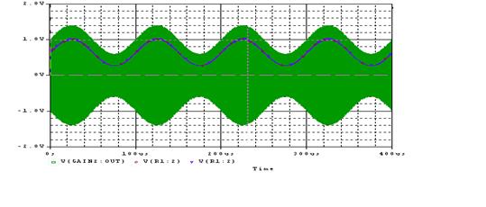 Результаты работы схемы показаны на рис. 8. На этом рисунке зелёным обозначается сигнал с выхода источника, синим – с выхода детектора. Искажения сигнала нет, коэффициент передачи детектора близок к единице. При номинальном напряжении на входе приёмника на выходе УПЧ амплитуда напряжения будет 1 вольт, на выходе детектора АРУ – 0,62 В. Когда амплитуда напряжения с выхода УПЧ увеличится на 3 дБ (то есть станет равным 1,4 В), тогда на выходе детектора будет напряжение, равное 1 В.