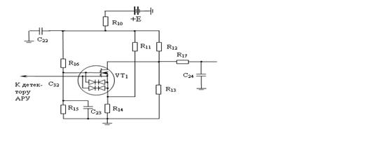 В исходном состоянии транзистор заперт, а на выходе есть максимальное напряжение, определяемое делителем R12 R13 . На резисторе R10 , который вместе с конденсатором С22 образует развязку по цепи питания. Когда напряжение, поступающее с выхода детектора АРУ, превысит напряжение на резисторе R14 плюс напряжение, при котором транзистор заперт, появится ток стока IC . Он пойдёт по цепи +Е R10 R12 VT1 R14 0, и начнёт понижать напряжение на выходе, так как начнёт повышаться падение напряжения на резисторах R14 , R12 , R13 .