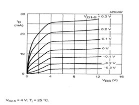 Выберем для этой схемы транзистор BF 908. Из проходной характеристики видно, для того, чтобы запереть транзистор, нужно напряжение затвор-исток -0,5 В, а его крутизна на начальном участке характеристики очень мала, и равна примерно 0,3 мА/В.