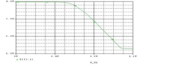 Результаты моделирования в Or Cad представлены на рис. 10. На нём видно, что при напряжении на входе, равном 0,6 В, напряжение на выходе только начинает снижаться, а при напряжении на входе, равном 1 В, напряжение на выходе равно 1,7 В.