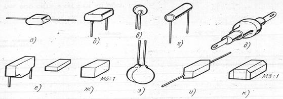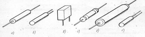 Основные конструкции бумажных, металлобумажных и пленочных конденсаторов приведены на рис. 2, а – е.