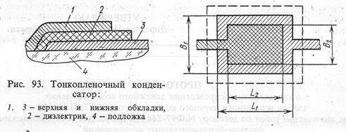 Тонкопленочные конденсаторы гибридных ИС (рис. 93) обладают более высокими свойствами: диапазон их емкостей лежит в пределах от единиц до 10 000 пФ, температурная стабильность составляет ±2*10