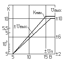 Рис.6. Зависимость минимального значения коэффициента усиления и максимальных выходных напряжений ОУ К153УД1Б от напряжений источника питания.