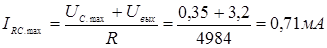 и тока RC цепи. Максимальный ток RC протекает в момент переключения схемы т.е. когда происходит перезарядка конденсатора с уровня Uc . max =Uпос =Uвых* b = 0,35В выходным напряжением ОС обратной полярности 3,2В через минимальное сопротивление RC цепи.