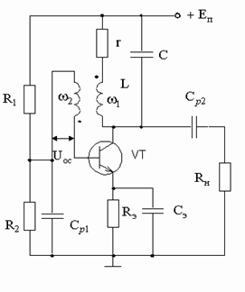 Такой генератор строят на основе усилительного каскада на транзисторе, включая в его коллекторную цепь колебательный LC-контур. Для создания ПОС используется трансформаторная связь между обмотками W1