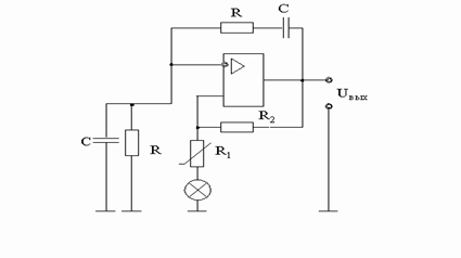 Регулирование частоты в этом генераторе осуществляется одновременным изменением сопротивлений Rили емкостей С. Для стабилизации амплитуды генерируемых колебаний в качестве сопротивления R1 применяют терморезистор с положительным температурным коэффициентом. Если при этом амплитуда выходного сигнала возрастет выше установившегося уровня, то возросший сигнал на выходе генератора приведет к увеличению напряжения и тока (то есть мощности) на R1. При нагреве R1 его сопротивление возрастет и коэффициент усиления по неинвертирующему входу уменьшится (то есть уменьшится наклон амплитудной характеристики усилителя по неинвертирующему входу). Это приведет к уменьшению амплитуды автоколебаний на выходе. Если же амплитуда автоколебаний уменьшится, то мощность выделяемая на R1 уменьшится. Его температура также уменьшится, что вызовет уменьшение его температуры. Коэффициент усиления возрастет, увеличится наклон характеристики, точка пересечения характеристик сместится вверх и обеспечит большую амплитуду. В качестве такого терморезистора можно использовать маломощную лампу накаливания.