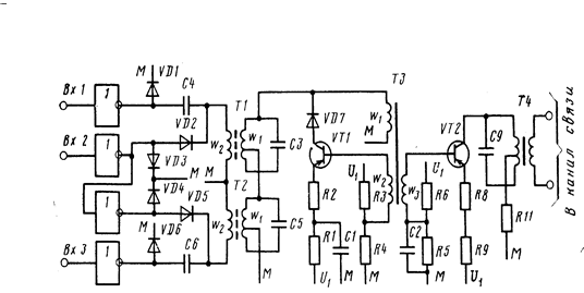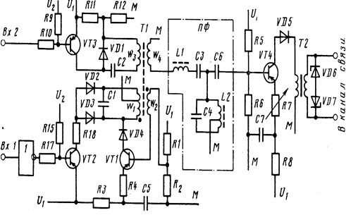 Сигнал 1, поданный на вход Bxl, включает генератор, так как VT2 закрывается и исчезает шунтирующее действие на контур диодов VD2 и VD3. Это приводит к возбуждению блокинг-генератора и появлению частоты в канале связи.