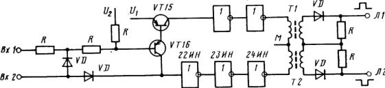 Нормально на вход Вх2 генератора полярных признаков в системе СКЦ (рис. 3) подан потенциал «О» и в линии сигнал отсутствует. Управление генератором при передаче сигналов производится по обоим входам. Если понизить потенциал только на входе Вх2, то в линию будет послан импульс с трансформатора Т2 (пассивное качество). Одновременное понижение потенциалов на входах Вх1 и Вх2 приводит к открытию транзисторов VT15, VT16, и соответственно посылке импульса, определяемого трансформатором Т1 (активное качество).