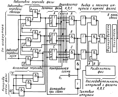 Для посылки сигнала 1 или 0 необходимо изменить фазу очередного импульса относительно текущего на 120° в одном или другом направлении. Подготовку и осуществление таких переходов производит специальная схема на входах триггеров А, В и С. Эта схема содержит шесть элементов И-НЕ подготовки перехода (переход из одной фазы в другую, осуществляемый данным элементом, соответствует обозначениям на его входе и выходе), а также три исполнительных элемента И-НЕ, определяющих момент переключения триггеров при посылке импульсов сигналов телеуправления (ТУ) или цикловой синхронизации (ЦС).