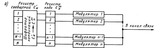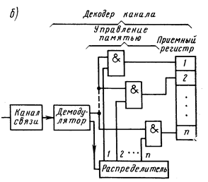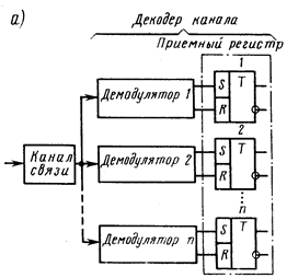 При параллельной передаче (рис. 1, а) сигнал поступает одновременно на входы всех демодуляторов (их число равно числу одновременно посылаемых сообщений), к выходам которых постоянно подключены элементы памяти, составляющие приемный регистр декодера.