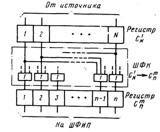 Отсюда общее правило: ШФК представляет собой комбинационную схему, содержащую N входов с т разветвлениями каждый, поданными на п схем ИЛИ, с выхода которых снимается код— комбинации из п элементов по т (рис. 8).