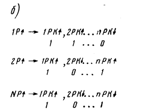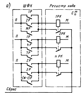 Схемная реализация ШФК обычно очень проста. В релейно-контактных системах на входе каждого разряда регистра кода включается набор (схема ИЛИ) контактов тех реле регистра сообщений (1P—NP), которые будут включаться при записи единицы в данном разряде кода (рис. 9).