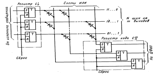 Аналогично в бесконтактных схемах (рис. 10) на вход каждого разряда регистра кода подключена схема ИЛИ (шина с диодами) с входами, подключенными к нужным шинам матрицы состояний регистра сообщений.