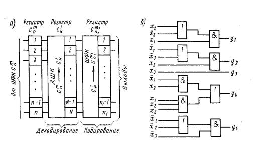 В системах телемеханики часто возникает необходимость перехода от одного вида кода к другому, например, от простого двоичного к корректирующему коду и т.п. Такие переходы выполняют кодопреобразователи. Они обеспечивают перевод каждой кодовой комбинации одного множества сигналов в эквивалентную ей комбинацию другого множества с измененным числом разрядов. Кодопреобразователи выполняются по структуре, приведенной на рис. 13, а. Такой преобразователь требует предварительного перевода исходной комбинации Сm n в C1 N (декодирования), а затем повторного кодирования по новой структуре ШФК, т. е. перехода: