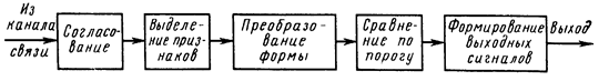 Вид демодулятора зависит от используемых импульсных признаков, однако, можно выделить следующие характерные функции (рис. 15): оптимальное согласование входа демодулятора с каналом связи; выделение импульсных признаков в сигнале; преобразование параметров выделенных признаков в форму, удобную для последующего анализа и сравнения; сравнение по порогу или с «образцами» сигнала; формирование выходных сигналов демодулятора.