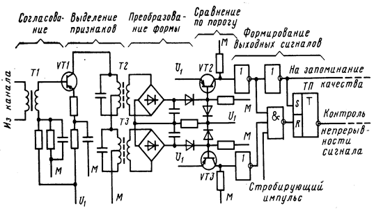Использование более простых импульсных признаков приводит к упрощению схемы демодулятора. На рис. 17. приведена схема демодулятора из системы СКЦ, использующей полярные признаки.