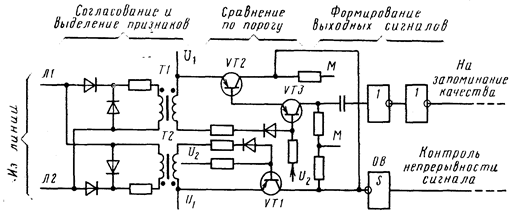 Ток линейной цепи в соответствии с полярностью проходит по первичной обмотке трансформатора Т1 и Т2. Напряжение вторичной цепи, существующее во время перемагничивания трансформатора, является управляющим для транзисторов VТ2, VТЗ или VТ1. Если оно превышает уровень, заданный напряжением смещения U2 , то соответствующий транзистор открывается и далее происходит формирование выходных сигналов для фиксации качества и работы схемы контроля непрерывности, а также для переключения распределителя.
