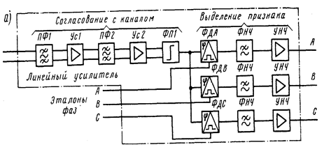 В блоке линейного усилителя (рис. 18, а) происходит предварительная обработка (до выделения фазы включительно) поступающих из канала связи импульсов сигнала, после чего они поступают в блок демодулятора на дальнейшие операции (рис. 18, б).