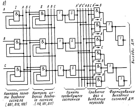 Одновременно с этим значение фазы подается на входы элементов сравнения, выявляющих направления изменения фазы и формирующих сигналы, соответствующие символам «1» и «О». Три таких элемента предназначены для выявления переходов фазы в направлении А→В→С→А, т. е. при передаче символа «1», а три других – для противоположных переходов при передаче символов «0». Каждый элемент сравнивает текущее значение фазы (сигнал 1 на входе) со значением фазы предыдущего такта (сигнал 1 на другом входе, связанном с шиной А', В' или С'}.