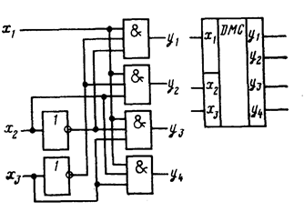 Рис. 19. Функциональная схема и условное обозначение демультиплексора
