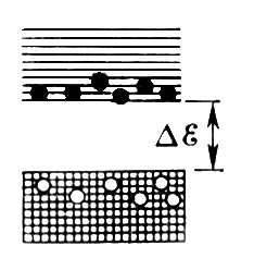 Рис. 2. Заполнение энергетических зон в полупроводнике; показаны только валентная зона и зона проводимости; чёрные кружочки — электроны в зоне проводимости, белые — дырки в валентной зоне.