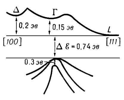 Зонная структура наиболее полно изучена для алмазоподобных Полупроводники, в первую очередь Ge, Si и соединений AIIIBV; многое известно для Te, соединений AIVBVI и др. Весьма типичной является зонная структура Ge (рис. 3), у которого вблизи своего верхнего края соприкасаются две валентные зоны. Это означает существование двух типов дырок — тяжёлых и легких с эффективными массами 0,3 m0 и 0,04 m0. На 0,3 эв ниже расположена ещё одна валентная зона, в которую, однако, как правило, дырки уже не попадают. Для зоны проводимости Ge характерно наличие трёх типов минимумов функции E (р): L, Г и D. Наинизший из них — L-минимум, расположенный на границе зоны Бриллюэна в направлении кристаллографической оси [111]. Расстояние его от верхнего края валентной зоны и есть ширина запрещенной зоны DE = 0,74 эв (при температурах, близких к абсолютному нулю; с ростом температуры DE несколько уменьшается). Эффективные массы вблизи L-минимума сильно анизотропны: 1,6m0 для движения вдоль направления [111] и 0,08m0 для перпендикулярных направлений. Четырём эквивалентным направлениям [111] (диагонали куба) в кристалле Ge соответствуют 4 эквивалентных L-минимума. Минимумы Г и Д расположены соответственно при р = 0 и в направлении оси [100], по энергии выше L-минимума на 0,15 эв и 0,2 эв. Поэтому количество электронов проводимости в них, как правило, гораздо меньше, чем в L-минимуме.