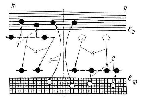 Рекомбинация и захват всегда означают переход носителя на более низкие уровни энергии (в валентную зону или запрещенную). Различные механизмы рекомбинации отличаются друг от друга тем, куда и каким образом передаётся выделяемая при таком переходе энергия. В частности, она может излучаться в виде кванта света. Такая излучательная рекомбинация наблюдается в любом Полупроводники Полное число актов излучательной рекомбинации в сек пропорционально произведению p-n и при небольших концентрациях носителей этот механизм рекомбинации мало эффективен. Однако при больших концентрациях (~1017см3) некоторые Полупроводники становятся эффективными источниками света (рекомбинационное излучение) в узком диапазоне длин волн, близких к lмакс. Ширина спектра ~kT, обусловленная различием энергии рекомбинирующих носителей, гораздо меньше средней энергии фотонов. Используя разные Полупроводники, можно создавать источники света почти любой длины волны в видимой и близкой инфракрасной областях спектра. Так, например, меняя в сплаве GaAs — GaP содержание GaP от 0 до 100%, удаётся перекрыть видимый спектр от красной до зелёной областей включительно.