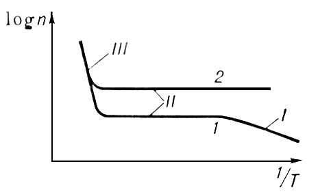 Рис. 5. Температурная зависимость концентрации n носителей тока в умеренно легированном (1) и сильно легированном (2) полупроводниках: I — область частичной ионизации примесей; II — область их полной ионизации; III — область собственной проводимости.
