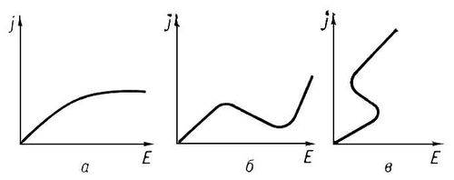 Рис. 6. Различные типы нелинейных зависимостей плотности тока j = ennд от напряжённости электрического поля Е в полупроводниках; а — насыщающаяся; б — N-oбразная; в — S-oбразная.