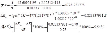 г) Проверить правильность построения графика, выполнив обратную задачу: используя значение tg α, найти ширину запрещенной зоны полупроводника ∆Е, сравнить с исходным значением ∆Е. Найти погрешность δ(∆Е).