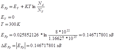 9. Найти положение уровней Ферми в p - n -перехода и n -областях относительно потолка зоны проводимости и дна валентной зоны соответственно .(Т=300К)