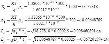17. Вычислить коэффициент диффузии для электронов и дырок ( в см²/с) и диффузионную длину для электронов и дырок (в см) при Т=300 К
