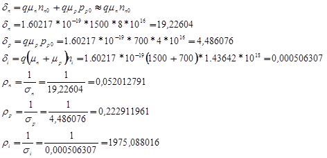 18. Вычислить электропроводность и удельное сопротивление собственного полупроводника, полупроводника n-и p-типа при Т=300 К