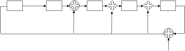 Таким образом, построим кодер циклического кода для чего воспользуемся правилом: если пронумеровать ячейки регистра возрастающими степенями Х (Х0,Х1,...,Хr+1) - то сумматоры включаются на входах тех ячеек, которые соответствуют ненулевым членам образующего полинома, кроме младшей ячейки Х0. Также добавим, что для ввода разрядов делимого схему устройства деления необходимо дополнить еще одним сумматором по модулю два, включенным в цепь обратной связи таким образом, что один вход подключен к выходу старшей ячейки регистра, на второй вход подаются разряды делимого, а выход подключен к цепи обратной связи. Таким образом, общее количество сумматоров по модулю два получается на единицу меньше веса образующего числа. Схема устройства деления на образующий полином Р(Х)=X4+X3+X2+1 изображена на рис. 2.1:
