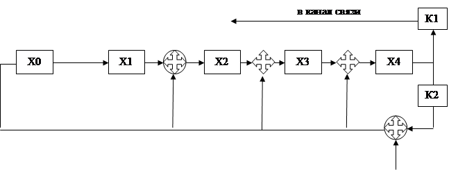 После окончания формирования проверочных разрядов их нужно передать в канал вслед за информационными. Поэтому кодер, помимо устройства вычисления проверочных разрядов должен еще содержать ключ 1 (рис.2.2), который, замыкаясь после окончания формирования проверочных разрядов, пропускает через себя в канал сформированные проверочные разряды. Пока проверочные разряды не сформированы - он разомкнут. Кодер содержит еще ключ 2. Этот ключ отключает цепь обратной связи при выводе проверочных разрядов в канал (на вход модулятора). В противном случае выходящие в канал проверочные разряды, поступая по цепи обратной связи на сумматоры, изменяют уже сформированные разряды.