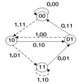 Сверточный кодер можно рассматривать как постоянный во времени конечный автомат, структура которого является периодической и может быть описана с помощью различных диаграмм. Например, сверточный кодер может быть описан диаграммой состояний. Диаграмма представляет собой направленный граф и описывает все возможные переходы кодера из одного состояния в другое, а также содержит выходные символы кодера, которые сопровождают эти переходы. Пример диаграммы состояний показан на рисунке 3.4. В кружках указаны четыре возможных состояния кодера 00, 10, 01, 11, линиями со стрелками - возможные переходы. Сплошная линия отмечает переходы, совершаемые при поступлении на вход кодирующего устройства информационного символа 0, пунктирная - при поступлении символа 1. Символы около линий обозначают символы на входе и выходе кодера, соответствующие данному переходу.