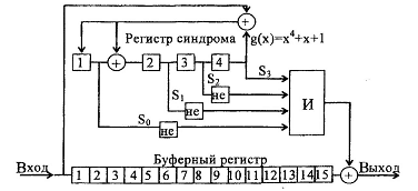 На рис.4.1 приведена схема декодера циклического кода (15,11), а на рис.4.2 приведена схема декодера циклического кода (23,12).