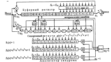 Принимаемая последовательность записывается в ячейки буферного регистра и поступает в декодирующий регистр. На k-м такте ключ К1 закрывается, благодаря чему в буферном регистре оказываются лишь информационные разряды принимаемой комбинации. Проверочные разряды продолжают поступать в декодирующий регистр. На n-м такта, после приема последнего разряда кодовой комбинации, открывается ключ К2. Если комбинация принята без ошибок, то в ячейках декодирующего регистра будут записаны нули, а сигнал "ошибка" будет отсутствовать. Наличие же в тех или иных ячейках декодирующего регистра единиц свидетельствует об ошибках в принимаемой информации. На выходе схемы ИЛИ в таком случае появляется сигнал "ошибка", который может быть использован для стирания ошибочно принятой информации, накопленной в буферном регистре.