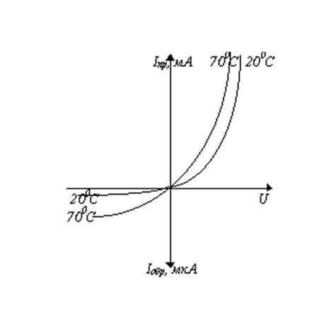Зависимость вольтамперной характеристики кремниевого диода от температуры показана на рис.2.. Из рисунка 2. следует, что ход прямой ветви вольтамперных характеристик при изменении температуры изменяется незначительно. Это объясняется тем, что концентрация основных носителей заряда при изменении температуры практически почти не изменяется, т.к. примесные атомы ионизированы уже при комнатной температуре.Количество неосновных носителей заряда определяется температурой и поэтому ход обратной ветви вольтамперной характеристики сильно зависит от температуры, причем эта зависимость резко выражена для гермениевых диодов. Величина напряжения пробоя тоже зависит от температуры. Эта зависимость определяется видом пробоя p-n перехода. При электрическом пробое за счет ударной ионизации