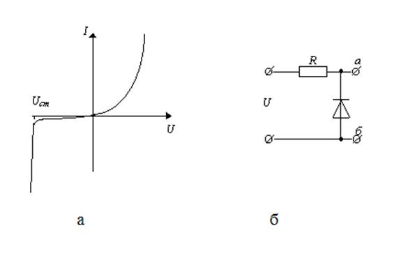 Рис. 2.1 а ВАХ стабилитрона, б принципиальная схема стабилитрона напряжения
