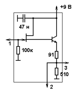 Во избежание нарушения нормальной работы приемника при подключении измерительной аппаратуры некоторые контрольные точки выведены через унифицированные контрольные модули (U1-U3 в Приложении 1) с коэффициентом передачи, равным примерно единице. Принципиальная схема согласующего модуля приведена на рисунке 1.1.2. Модуль обладает высоким значением входного сопротивления (около 100 кОм), и не ухудшает избирательных свойств колебательных систем входной цепи, гетеродина и преобразователя частоты. Высокое входное сопротивление модуля