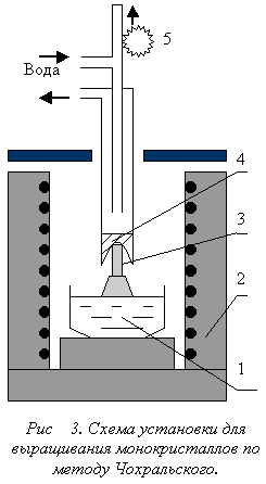 Монокристаллы для полупроводниковой промышленности (кремний, германий, рубин, гранаты, фосфид и арсенид галлия, ниобат лития и др.) изготавливаются, как правило, методом Чохральского путем вытягивания из расплава с помощью затравки. На рис. 3 приведена схема установки для выращивания монокристаллов по методу Чохральского. Тигель с расплавом 1 размещается в печи 2. Затравка 3, охлаждаемая холодильником 4, медленно поднимается под действием механизма вытягивания 5, увлекая за собой монокристалл полупроводникового материала. Монокристалл растет на затравке со скоростью до 80 мм/ч. Расплав смачивает затравку и удерживается на ней силами поверхностного натяжения. Температуру расплава и скорость кристаллизации можно изменять независимо. Отсутствие прямого контакта растущего монокристалла с тиглем и возможность изменения его геометрической формы позволяет получать бездислокационные монокристаллы. Получаемые методом Чохральского монокристаллы имеют форму цилиндра длиной до 1 метра и более и диаметром 20…300 мм.