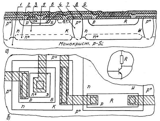 На рис 4,а приведен фрагмент структуры микросхемы, представляющей n-p-n-транзистор и включённый в коллекторную цепь резистор, а на рис. 4,б – топология этого же участка. На рис. 4,а цифрами обозначены: 1 – исходная монокристаллическая пластина – подложка; 2 – открытый слой; 3-эпитаксиальный слой (он же коллекторный); 4 – разделительный слой; 5 – базовый слой; 6 – эмиттерный слой; 7 – изолирующий слой с контактными окнами; 8 – слой металлизации; 9 – защитный слой (обычно SiO2).