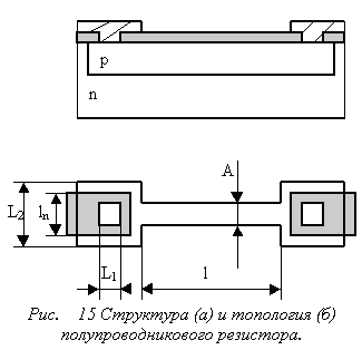 Проектирование полупроводниковых резисторов в ИМС.Структура и топология резистора, сформированного в полупроводниковом материале, приведены на рис. 15. Сопротивление резистора складывается из сопротивления линейной части, которое подчиняется выражению R=RслЧ/a, и сопротивления приконтактных областей, которое определяется через эмпирический коэффициент k, выраженный в долях Rсл.