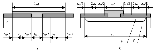 Далее рассмотрим расчёт размеров эмиттерной области, с которой начинается топологическое проектирование транзистора (рис. 20). Вначале определяется минимально возможный номинальный размер металлического вывода над контактным окном эп1 (рис. 20,а).