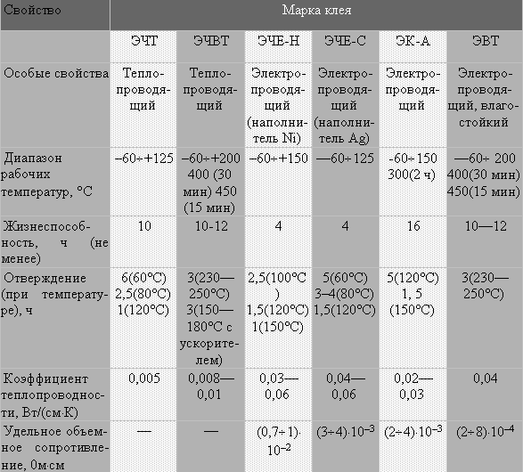 Таблица 13. Свойства электро- и теплопроводящих клеев на эпоксидной основе.