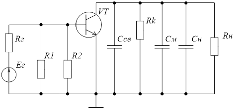 Эквивалентная схема каскада для высоких частот (ВЧ) не будет содержать конденсаторов C1 , Ce и Cc , так как их сопротивления на высокой частоте близко к нулю.