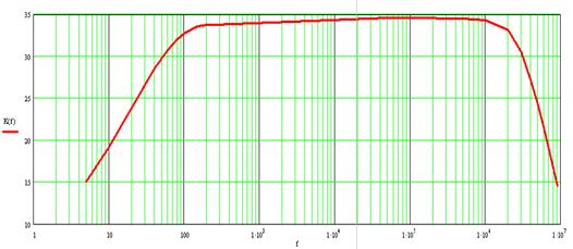 По данным из таблиц 2, 3 построим АЧХ усилительного каскада. По оси ординат отложим частоту усиливаемого сигнала в логарифмическом масштабе, по оси абсцисс – коэффициент усиления в дБ.
